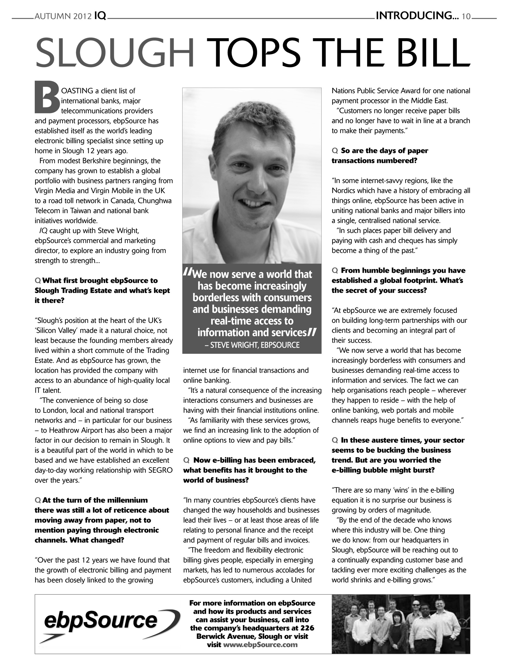 “From the moment the new e-billing service went live every customer touchpoint, from the website to the call centre, became a channel for promoting the benefits of online bill viewing, payment and self-service … and with ebpSource’s assistance, we are confident we have everything we need to stay several steps ahead for the future.”